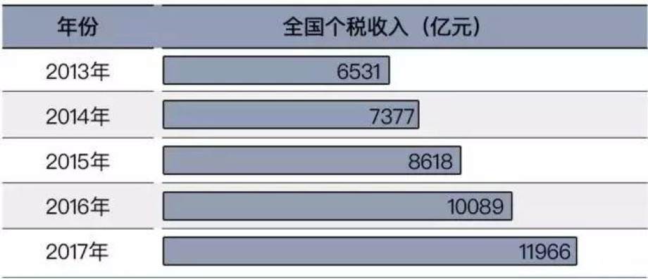 财政部的数据显示,我国个税缴纳额逐年增加。2017年个人所得税11966亿元,同比增18.6%! 看一下我国个税的增长幅度: